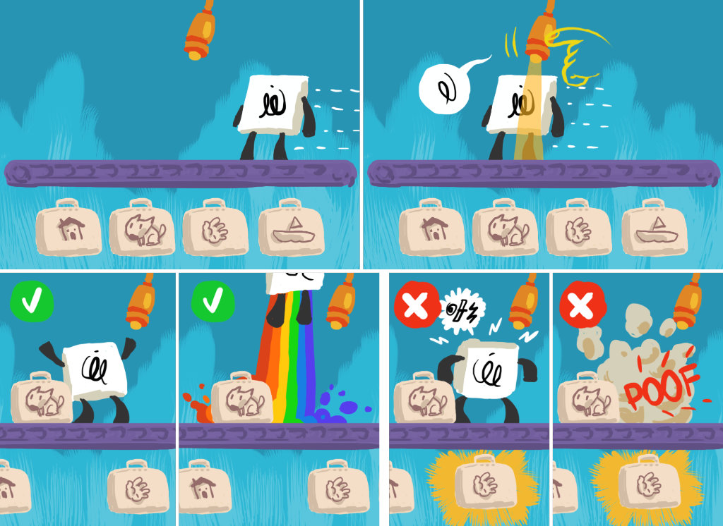 - On the bottom, we have a series of suitcases, each with a drawing. The player will have to drag/give the correct suitcase to the LL (based on word-image association). If the wrong suitcase is given, the LL goes away angry and the timer loses some seconds.